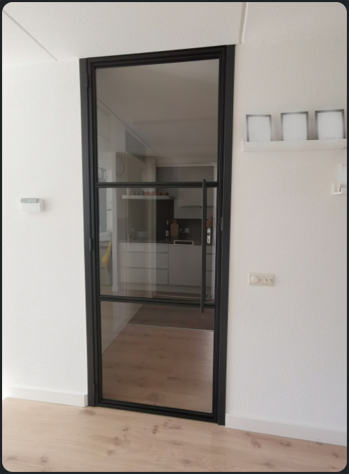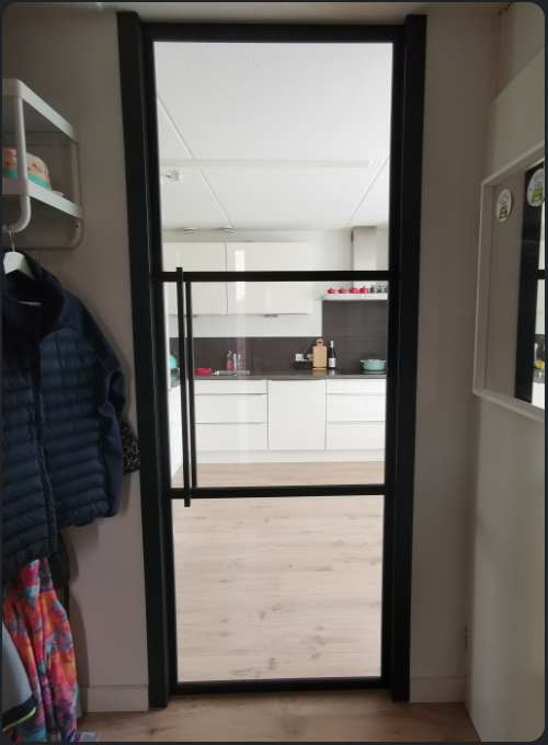 U kunt met een Overzetkozijn een volledige configuratie met zwart of witte Staallook deur realiseren voor 700 euro.